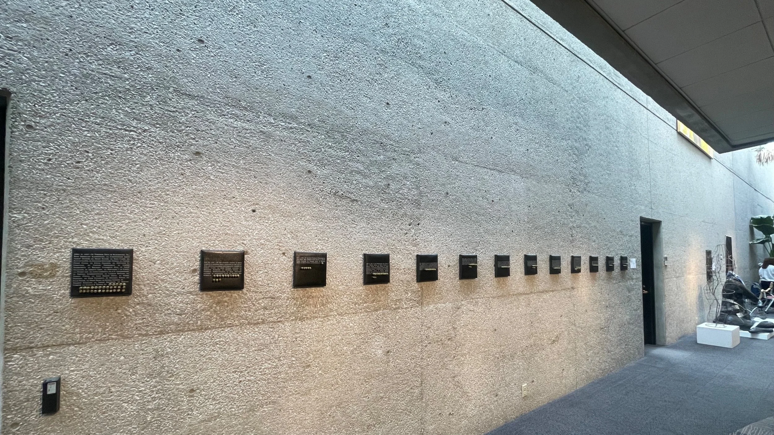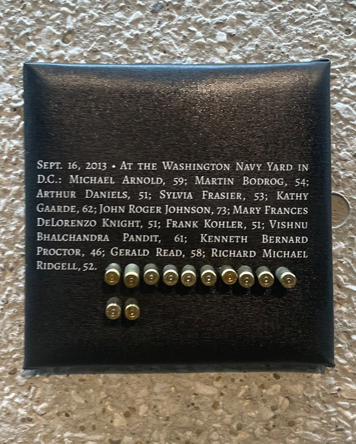 This installation was created by wrapping black canvas around handmade frames. The text includes where an act of gun violence happened, the date, and the names of the victims. Each bullet represents a victim.