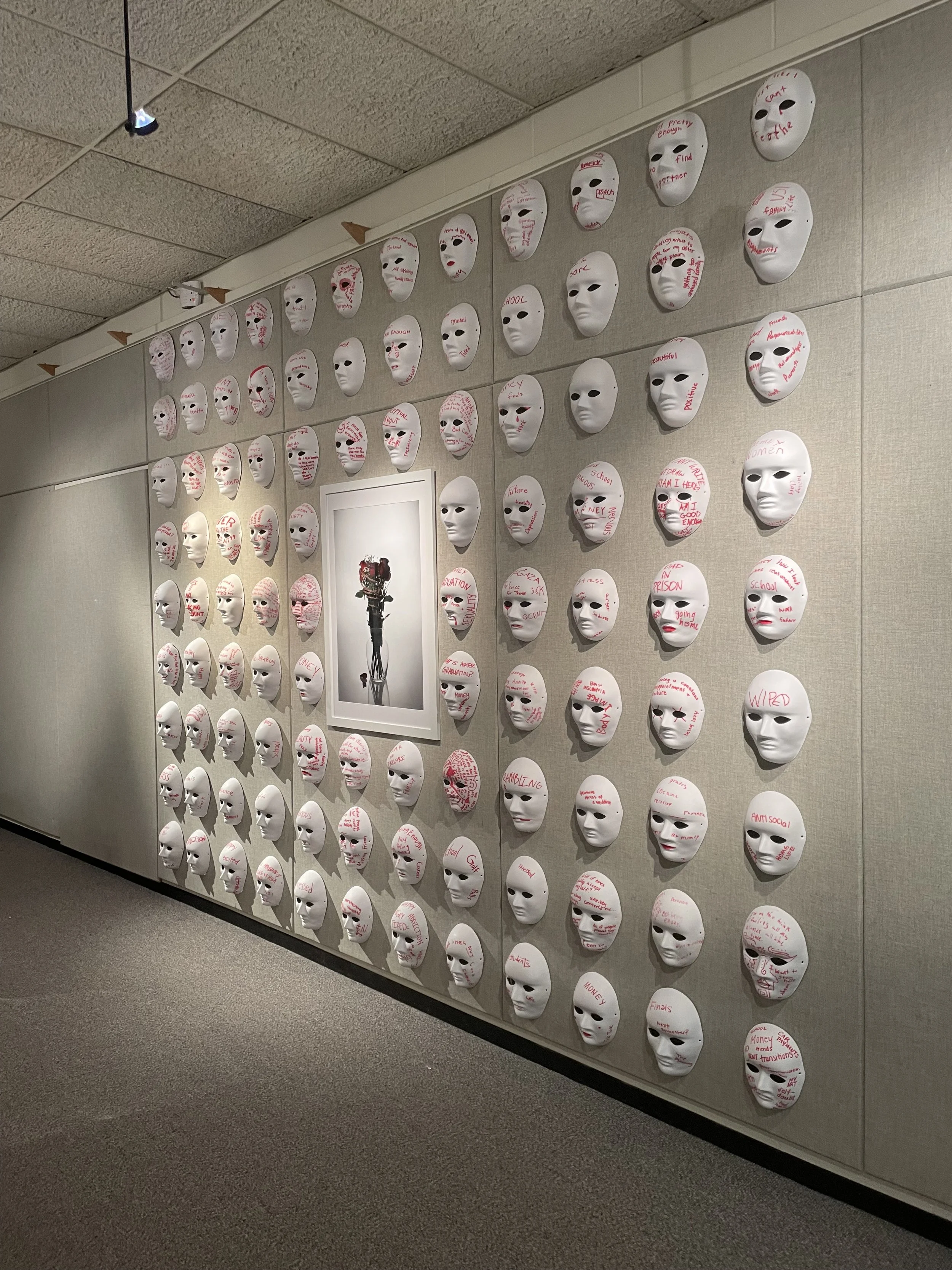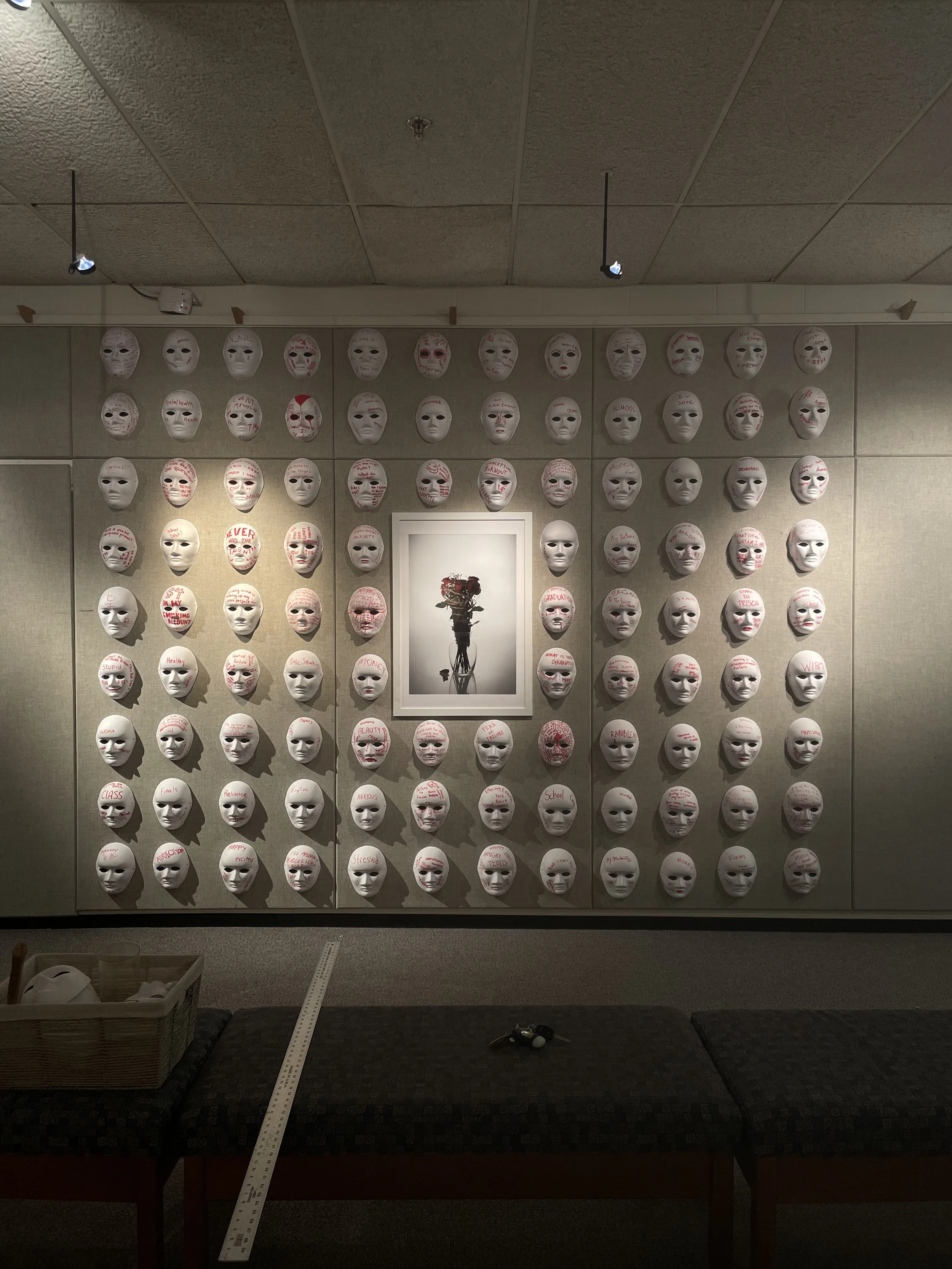This was an installation created by allowing students to write down fears, insecurities, and stressors onto white masks. The masks surrounded a photo of a vase of roses wrapped in rope.